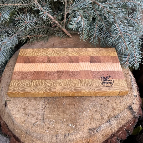 Prkénko je ošetřeno olejem vhodným pro styk s potravinami, takže je připravené na každodenní používání od krájení zeleniny až po servírování chutných jednohubek. Přitom zůstává příjemné na dotek, stabilní a vizuálně výrazné díky přirozenému kontrastu dřevin.