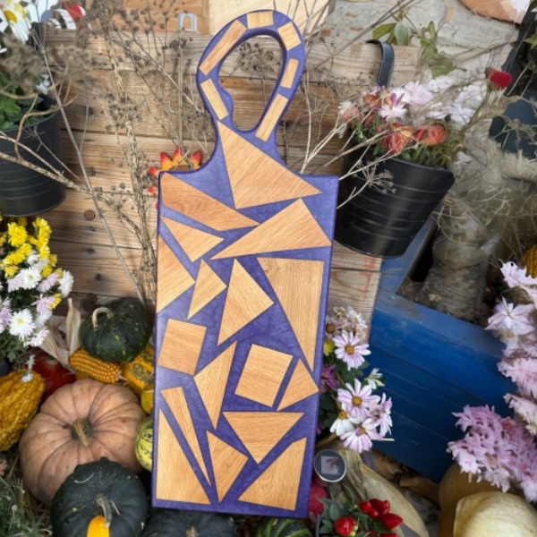 Tento kousek vznikl spojením masivních střípků dubového dřeva a fialové pryskyřice do výrazného geometrického designu. Každý detail je ručně opracovaný a výsledkem je prkénko, které funguje nejen v kuchyni, ale i jako dekorace a stylový doplněk pro servírování.
