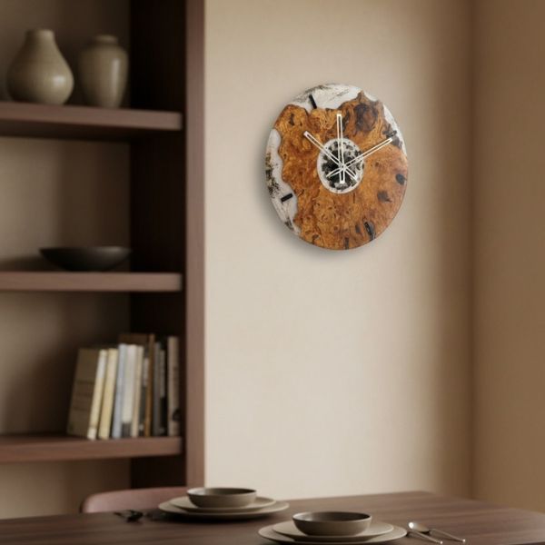 Model „Zlatý Suk“ je vytvořen z masivního dřeva s nádhernou, hlubokou kresbou a výraznými suky. Středová část je doplněna epoxidovou pryskyřicí, která vytváří jemný kontrast a dodává hodinám moderní nádech.